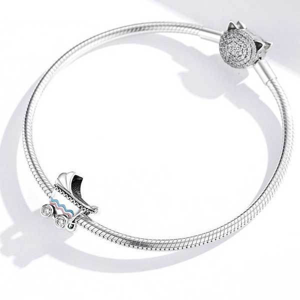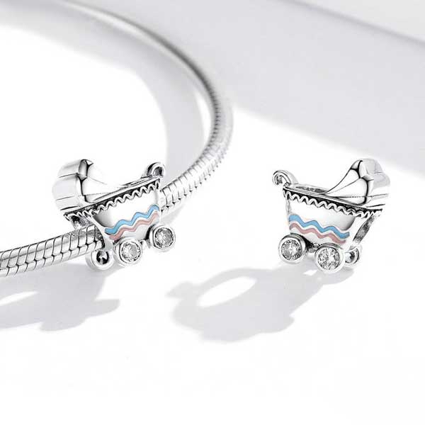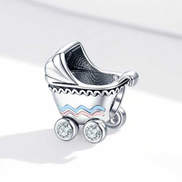 The ingenious craftsmanship of the Baby Pram CZ Charm is a perfect gift for new mothers or mothers-to-be. The baby carriage is full of happy memories of childhood. The cute little baby carriage has both blue and pink high temperature enamel waves on each side so makes it perfect for both boys and girls.