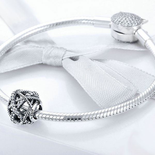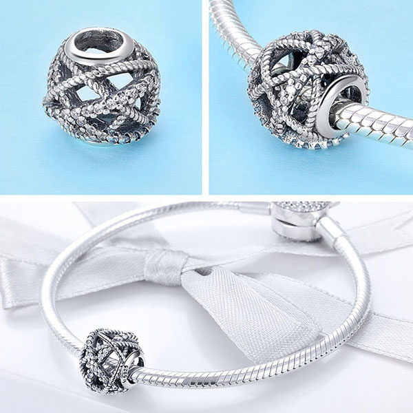 This delightful and Charming Twine Ball charm is certified sterling silver. This openwork charm has pavé-set cubic zirconia dotted around some of the strands of twine and rope. The charm does not have a screw-fitting but fits like a bead and has been oxidized to enhance the detail.