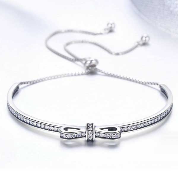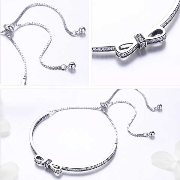 The unique design of the CZ Bow Adjustable Half Bangle means that you can wear this on it’s own or stacked with your other favourite bracelets. This is a simple chain suitable for daily wear. The CZ Bow Adjustable Half Bangle is certified sterling silver.