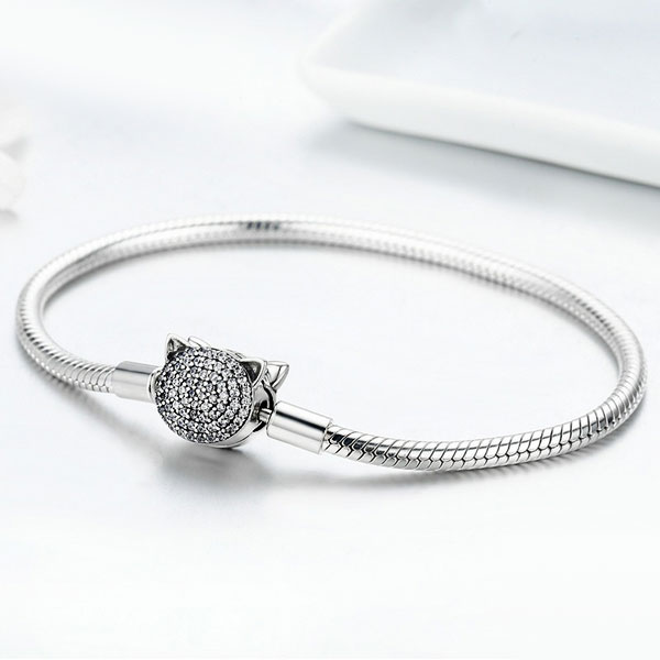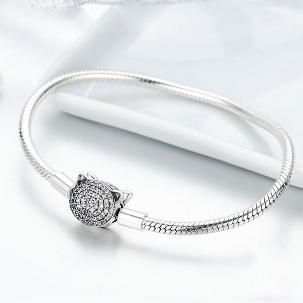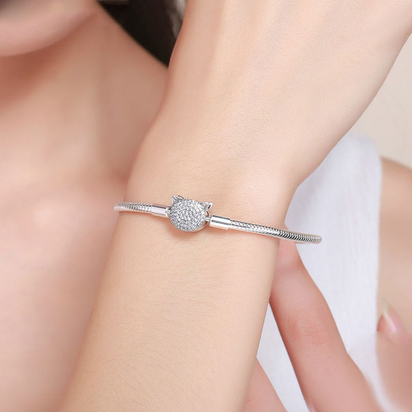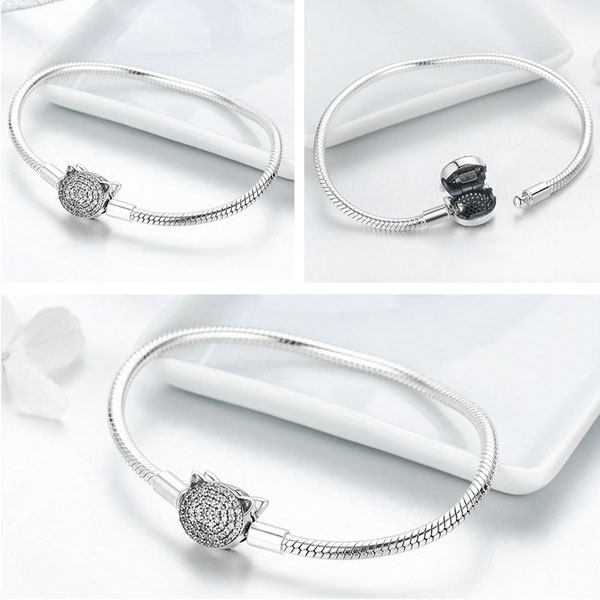 This dazzling CZ Cat Clasp Snake Bracelet is certified .925 sterling silver. Worn individually or stacked, silver bracelets are fashion staples that never go out of style. Transform the bracelet from daytime to evening wear by adding your favorite sparkling charms.
