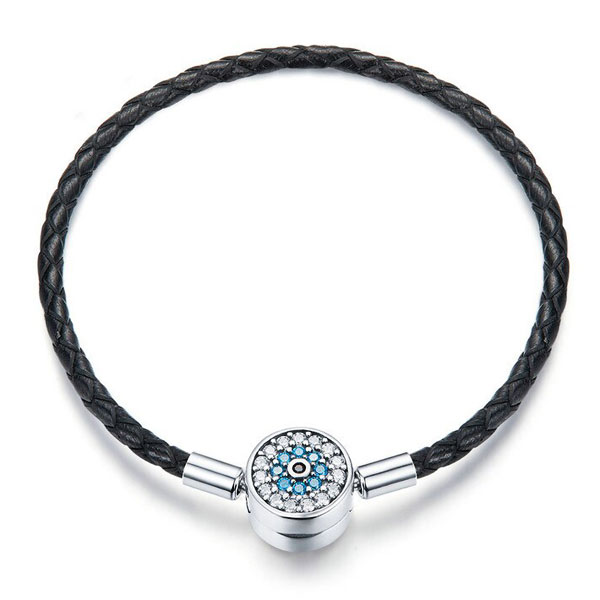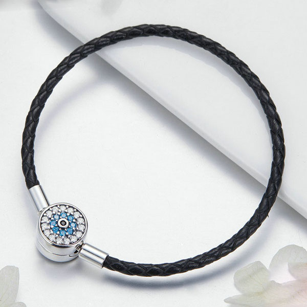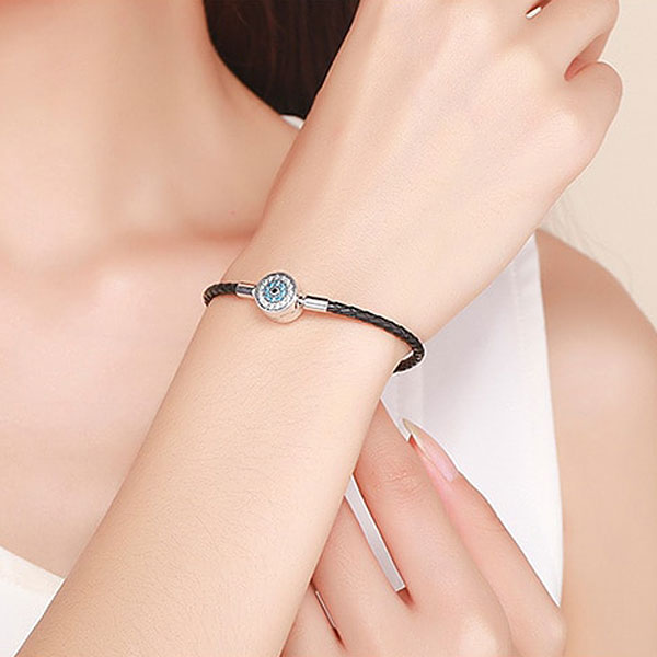 The clasp of the Dazzling Black Leather Bracelet is certified sterling silver and has pavé-set clear cubic zirconia. The bracelet is fully compatible with all major European charm bracelets.