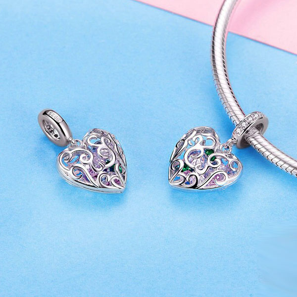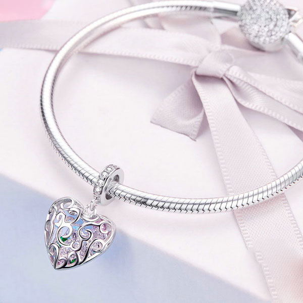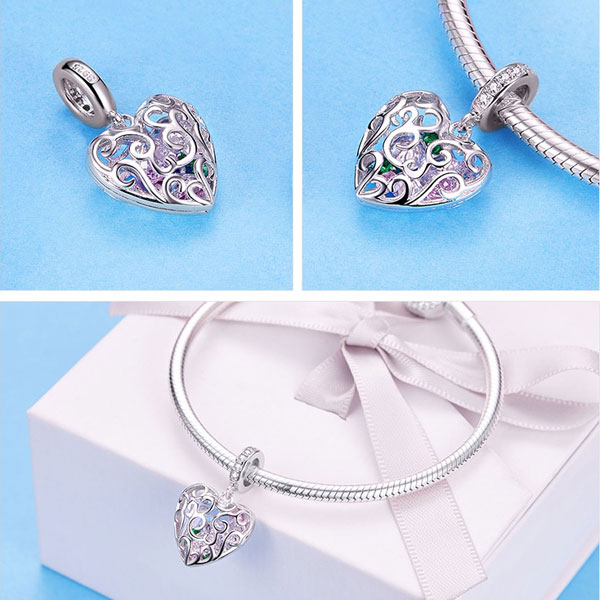 The delicate Filigree Heart Pendant Charm is a unique design – a beautiful openwork “cage” with loose, mullti-coloured Austrian crystals inside. Add your memories to your bracelet that can only be uniquely YOU.