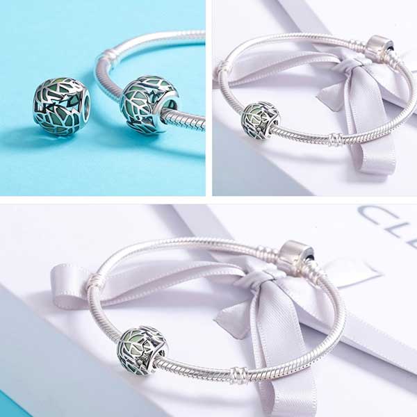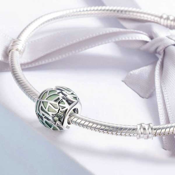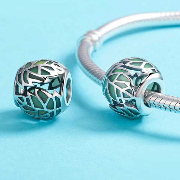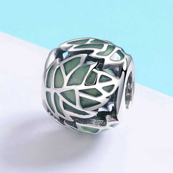 For those that love nature, the Leaf Ball Enamel Charm adds a gorgeous pop of soft green to your bracelet. The veins of the leaf are bright silver which have been filled in by a high-temperature enamel process. This gives the a “stained glass’ effect. There are four leaves alternating around the charm.