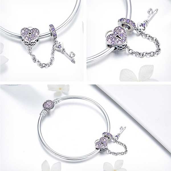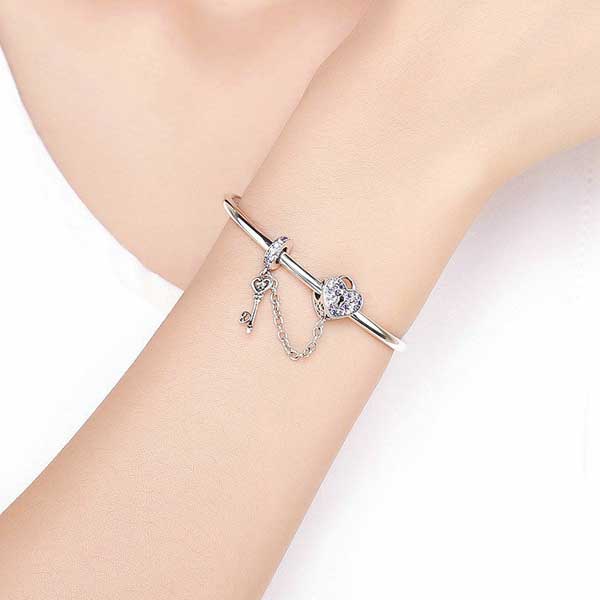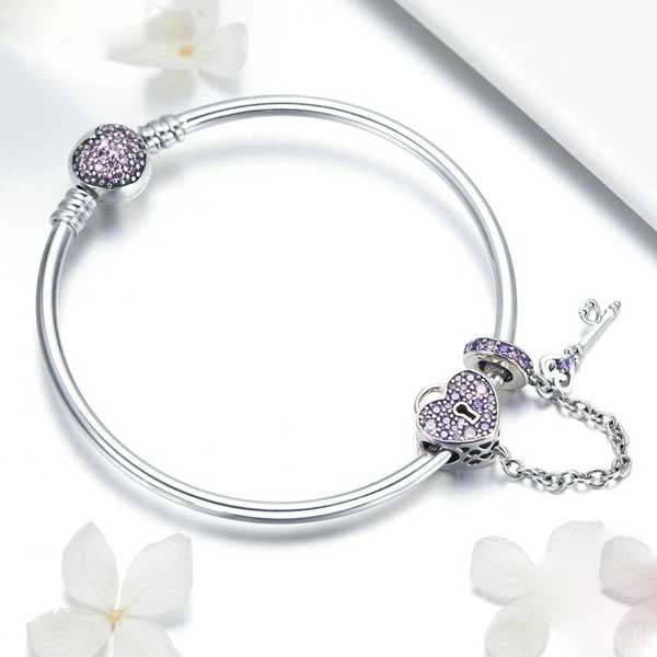 The Love Key Heart Charm Bracelet Set includes the Pink CZ Heart Bangle and the matching Key to My Heart Charm are certified .925 sterling silver. Worn individually or stacked, silver bracelets are fashion staples that never go out of style. Transform the bracelet from daytime to evening wear by adding your favorite sparkling charms.
