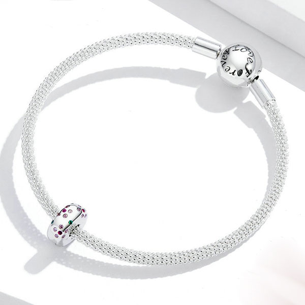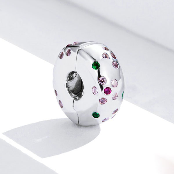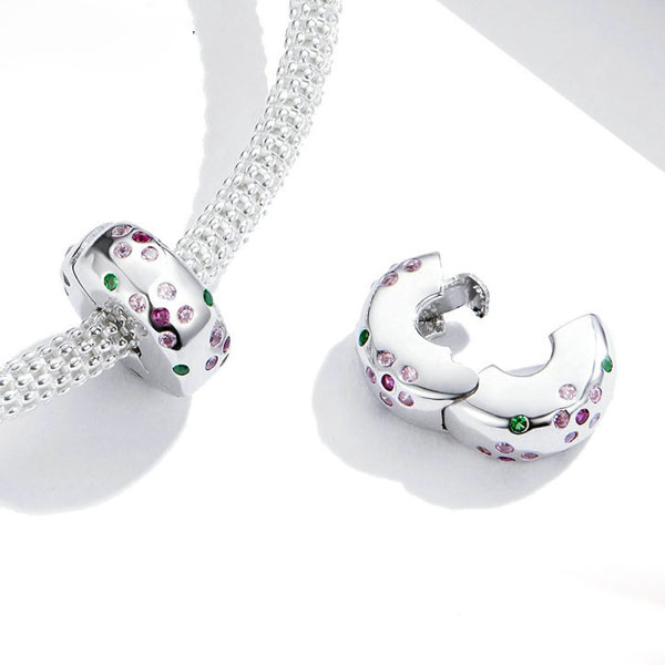 This clip has pale and darker pink, pavé-set cubic zirconia set in delicate blossoms around the circumference of the clip, with alternating tiny green CZ as leaves. In addition, you can use this bead as a spacer charm to add style and interest to your bracelet, or fill in between two of your favorite beads.