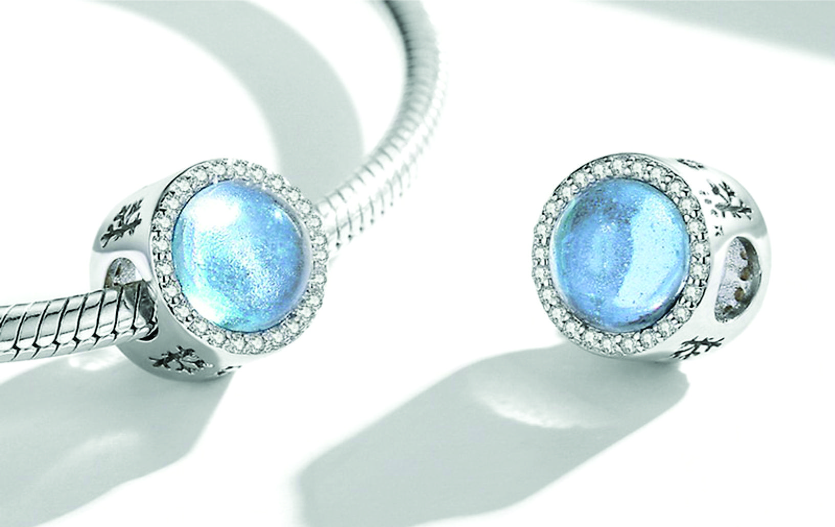 This Murano Glaze Snowflake Charm glistens with silver shiny snowflakes which surround the charm .